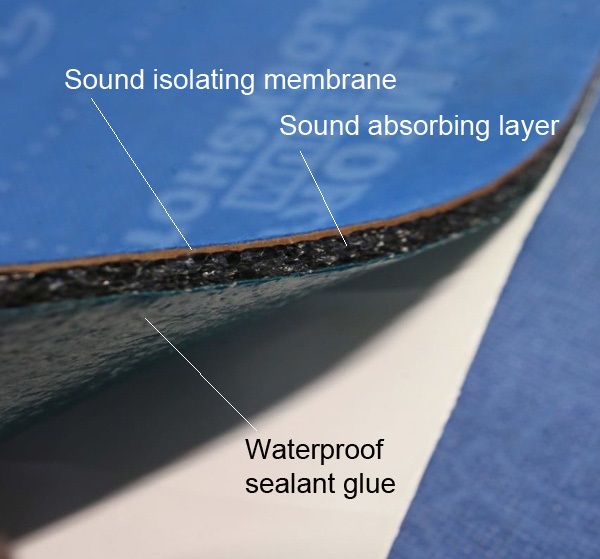 Αποτελείται από 3 στρώσεις: μεμβράνη με ακουστική μαστίχα υψηλής πυκνότητας, ηχοαπορροφητικό υλικό και συγκολλητικό σφραγιστικό.